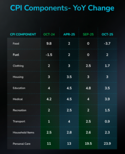 India’s late 2024 saw brutal food price spikes. Vegetables jumped, pulses surged, edible oils climbed. By December 2024, the CPI basket had absorbed substantial price increases. In December 2025, good monsoons flooded markets with produce, global commodity prices eased, and the government cut import duties strategically. Prices did not collapse; they normalized. But compared to inflated 2024 levels, the year-on-year calculation showed dramatic declines.​